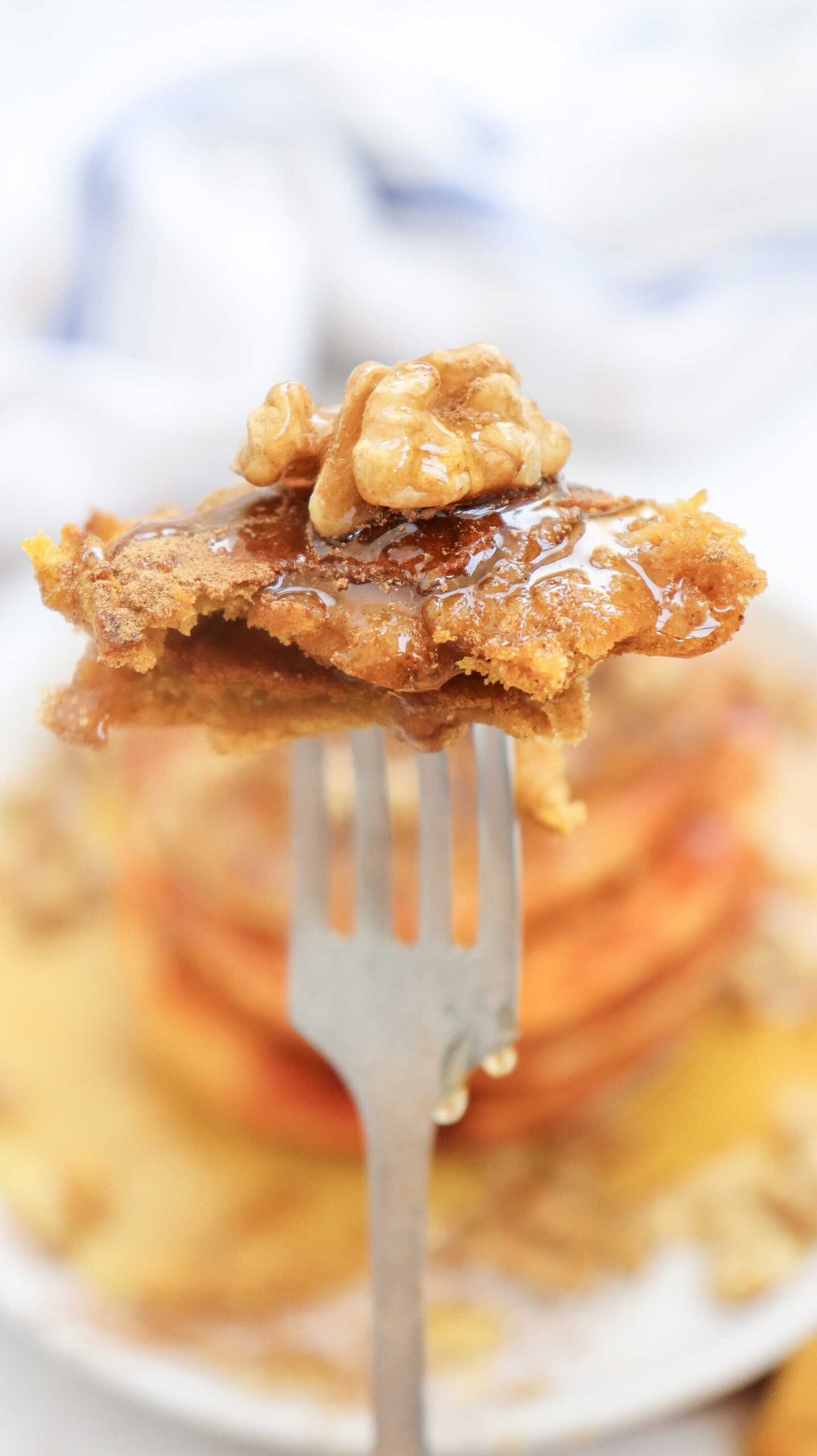 Serve them with maple syrup, whipped cream, and crunchy walnuts, and enjoy a stack of pancakes that tastes like autumn in every bite.