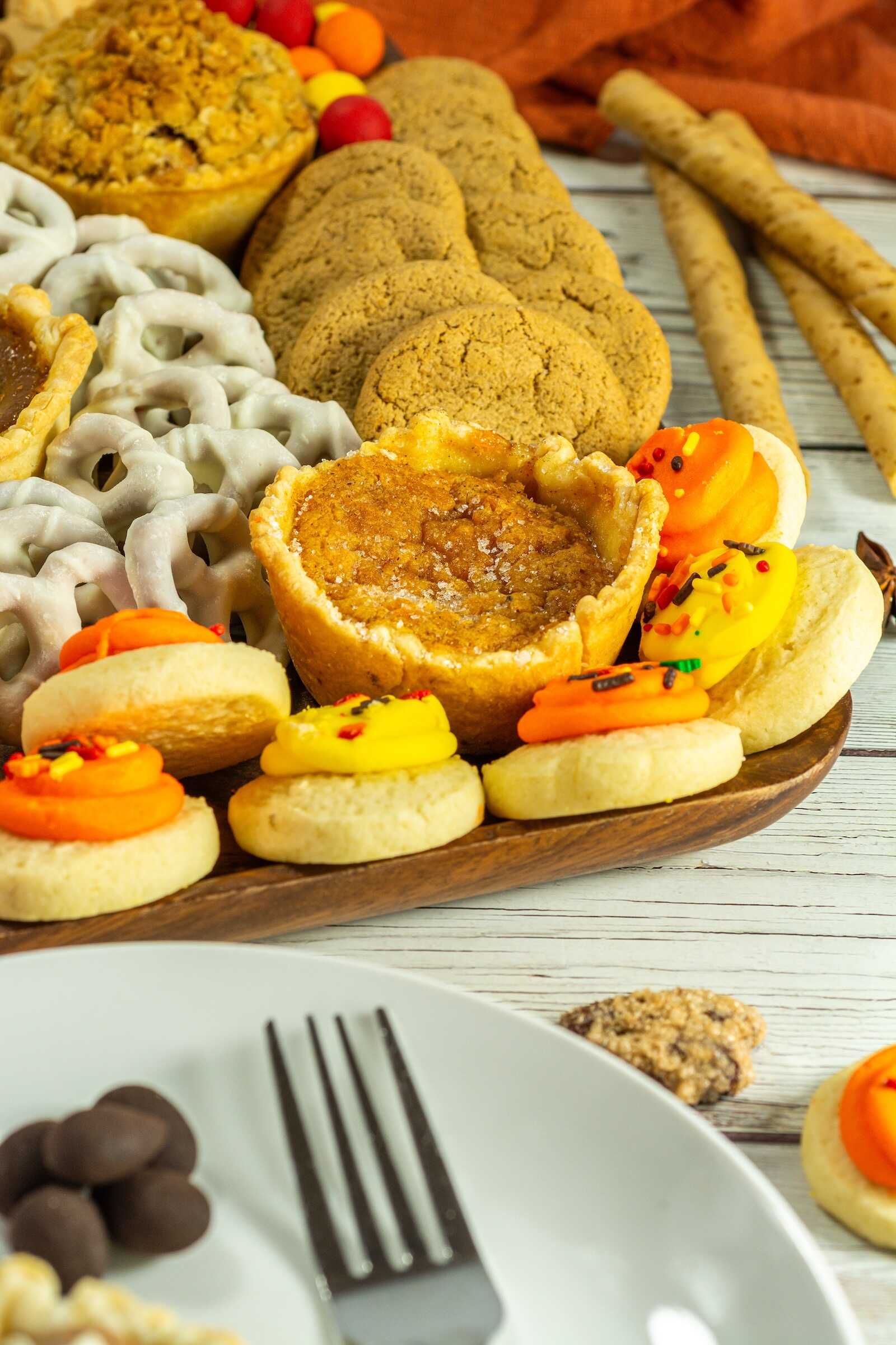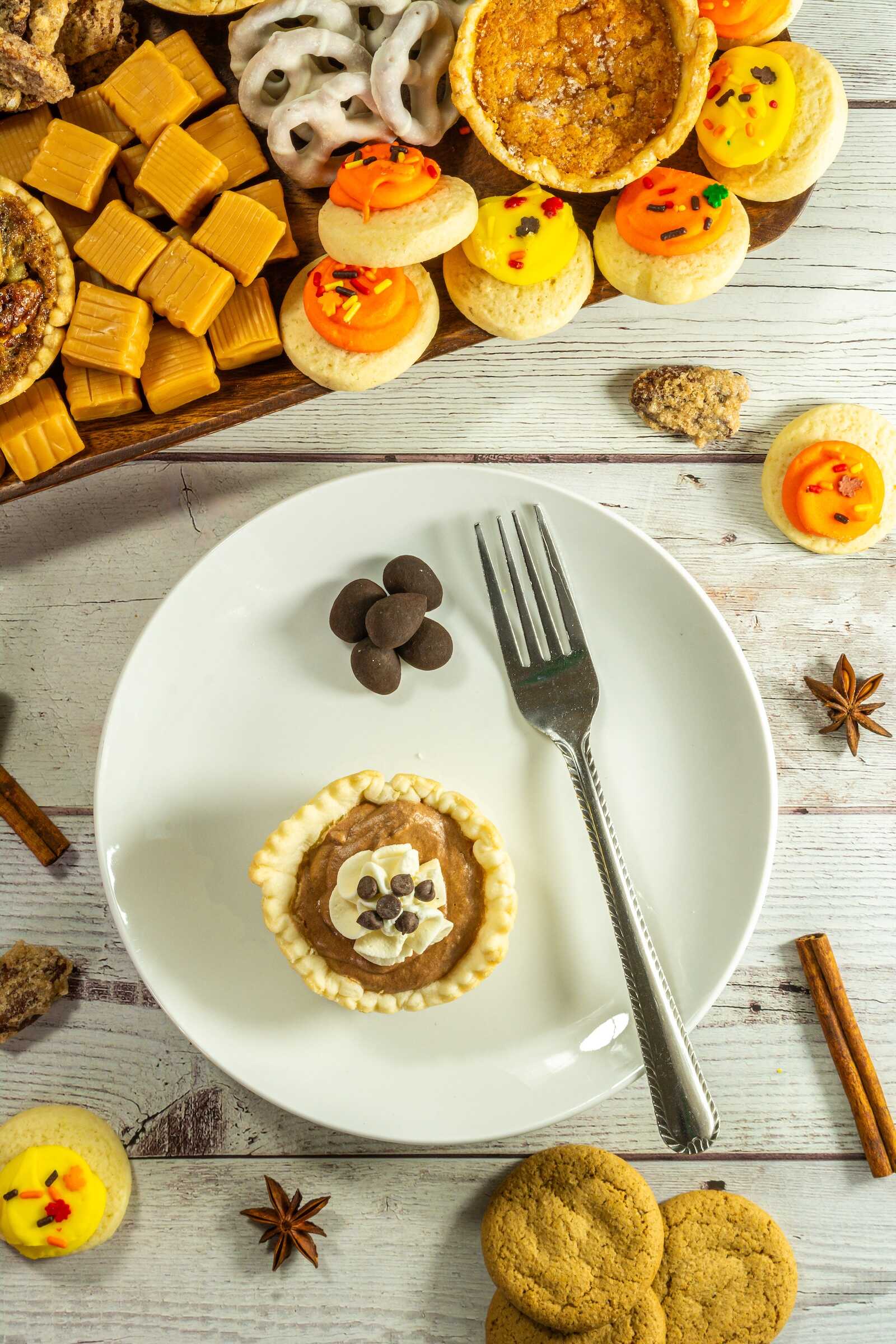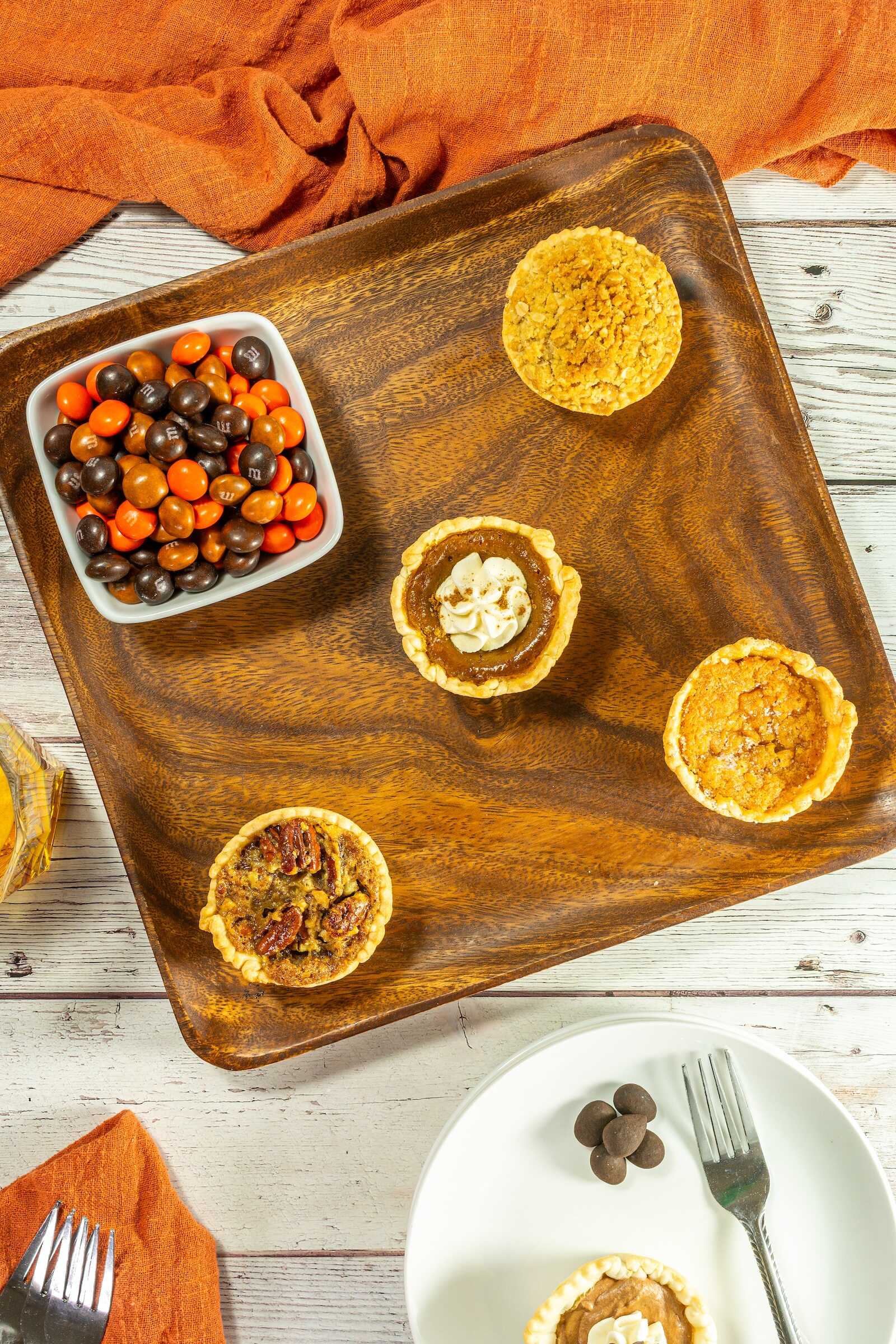 Mini pies are the stars of your fall dessert board. The contrast of pumpkin orange, pecan brown, and Dutch apple golden tones instantly brings fall to the table.