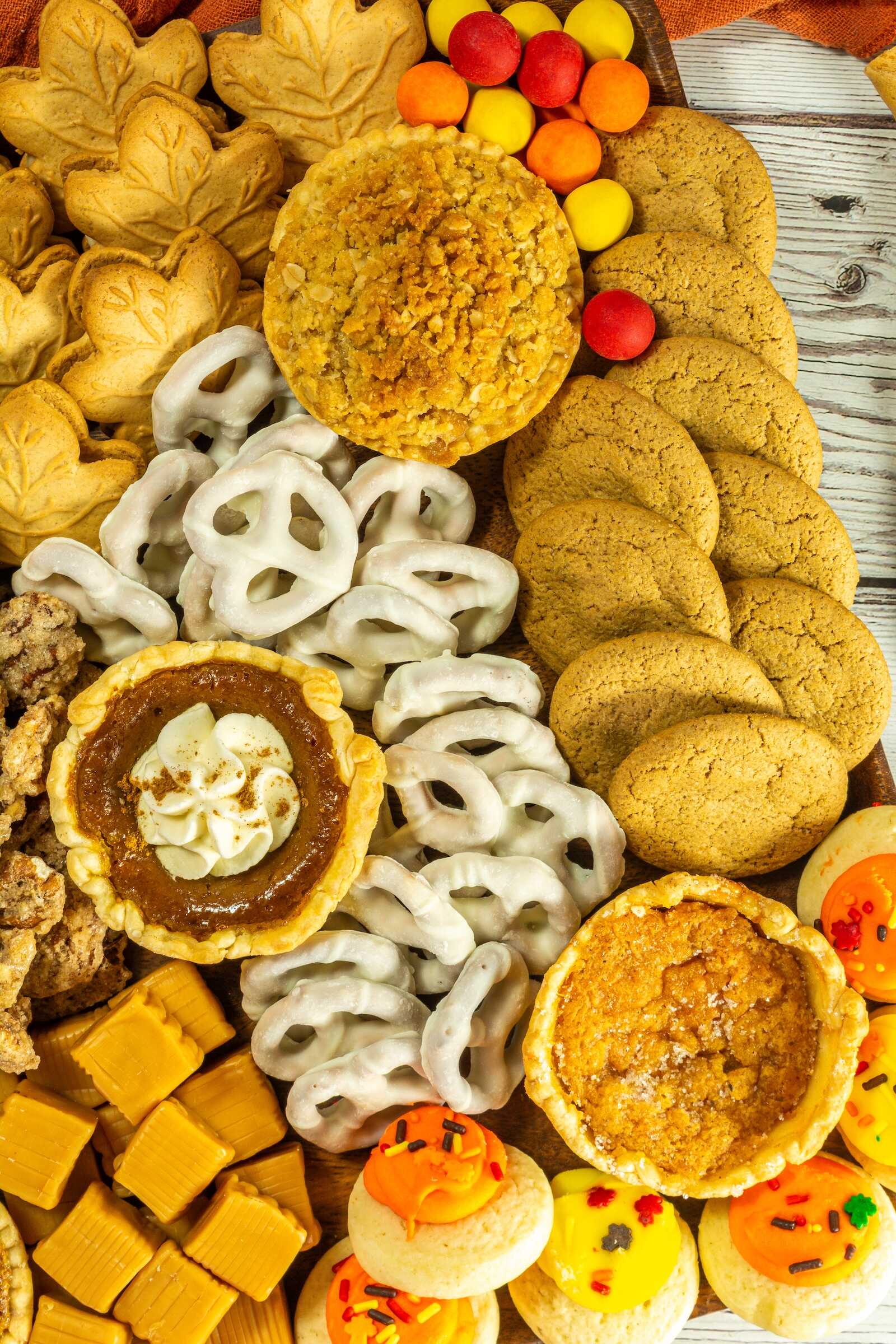 Use 3–5 decorated cookies for pops of bright orange, yellow, or white. Their bold colors help break up the browns and golds of the pies and pecans.